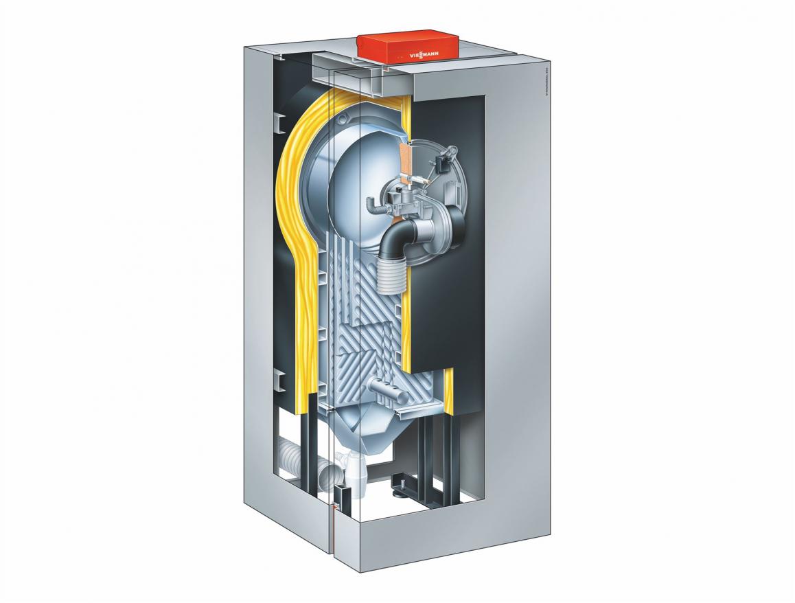 Mit seiner Konstruktion der senkrecht angeordneten Wärmetauscherflächen nutzt der Vitocrossal 300 die Kondensationswärme seiner Heizgase besonders intensiv aus. Damit beträgt der Wirkungsgrad bis zu 98 Prozent.