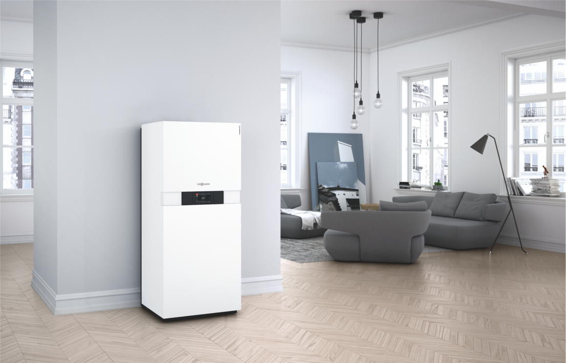 Der Vitodens 333-F kombiniert die Vorteile des Vitodens 300-W mit dem hohen Warmwasserkomfort eines Warmwasserspeichers in einem kompakten Standgerät.