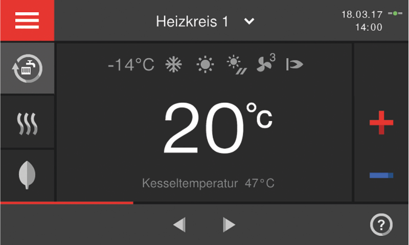Hoher Bedienkomfort über Farb-Touch-Display mit Klartext- und Grafikanzeige, integrierter Lüftungsbedienung, Inbetriebnahme-Assistenten, Anzeigen für Energieverbräuche sowie alternativ Bedienung über mobiles Endgerät